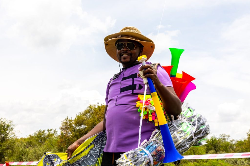 For Ayub Mwangi, a businessman from Nakuru, the rally represents far more than a sporting spectacle. Normally a tailor in Nakuru town, Ayub temporarily swaps his sewing kit for a selection of rally merchandise including kites, vuvuzelas and hats, setting up shop in Naivasha during the rally weekend.